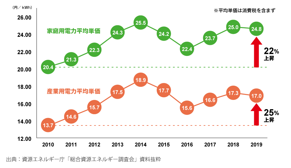 東日本大震災以降、原子力発電所の停止等により電力会社の値上げが相次ぎ、家庭用、産業用ともに電気料金が大幅に上昇しています。